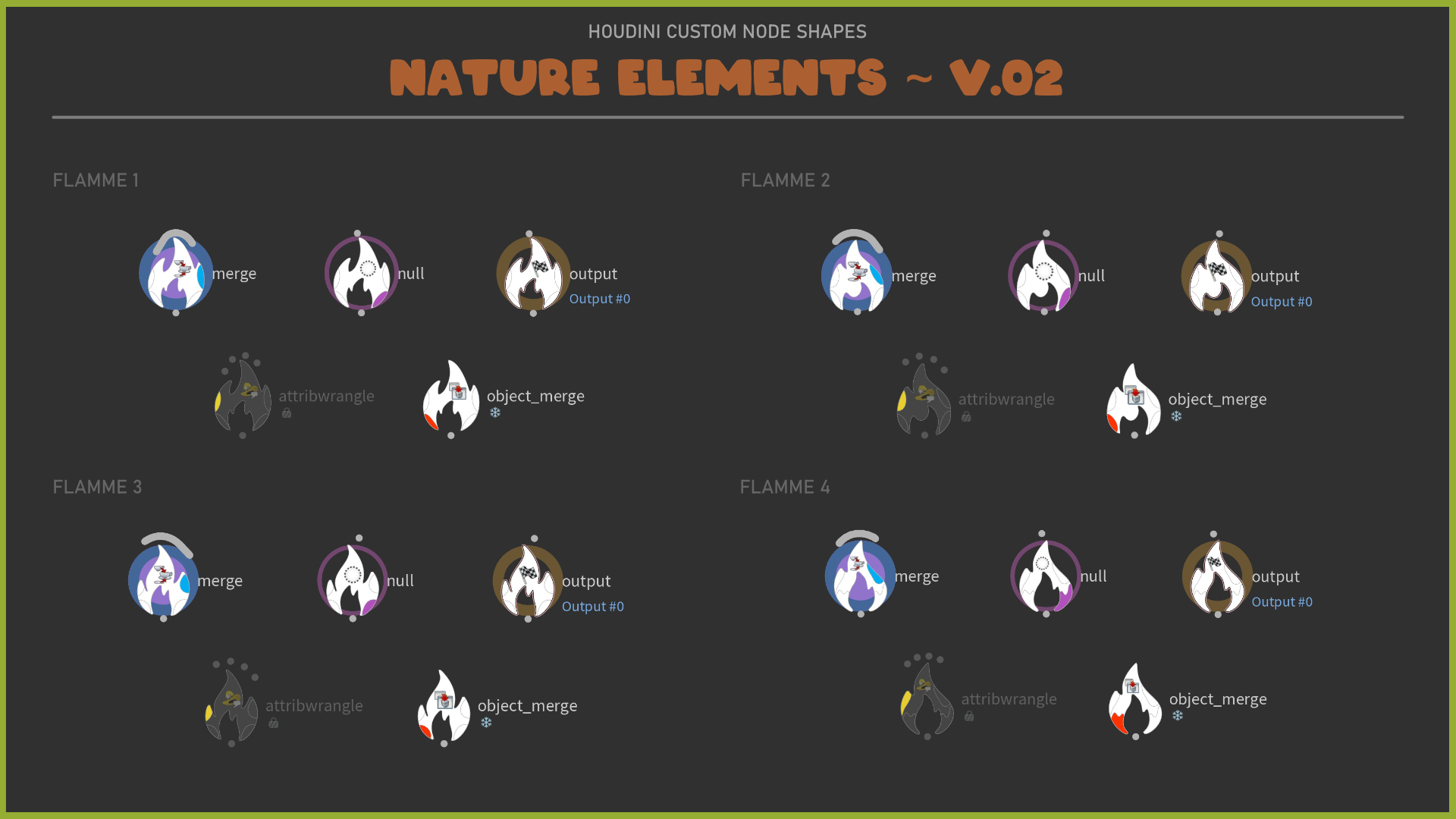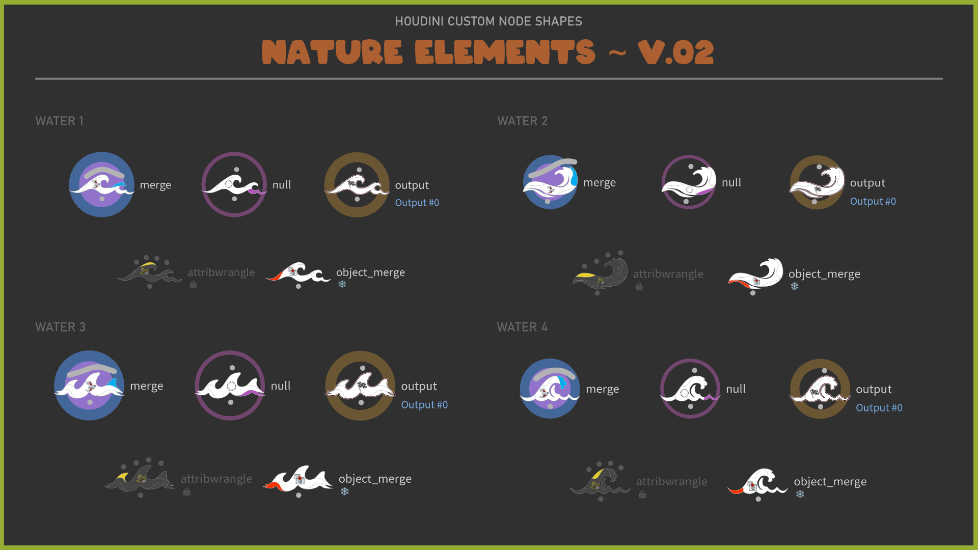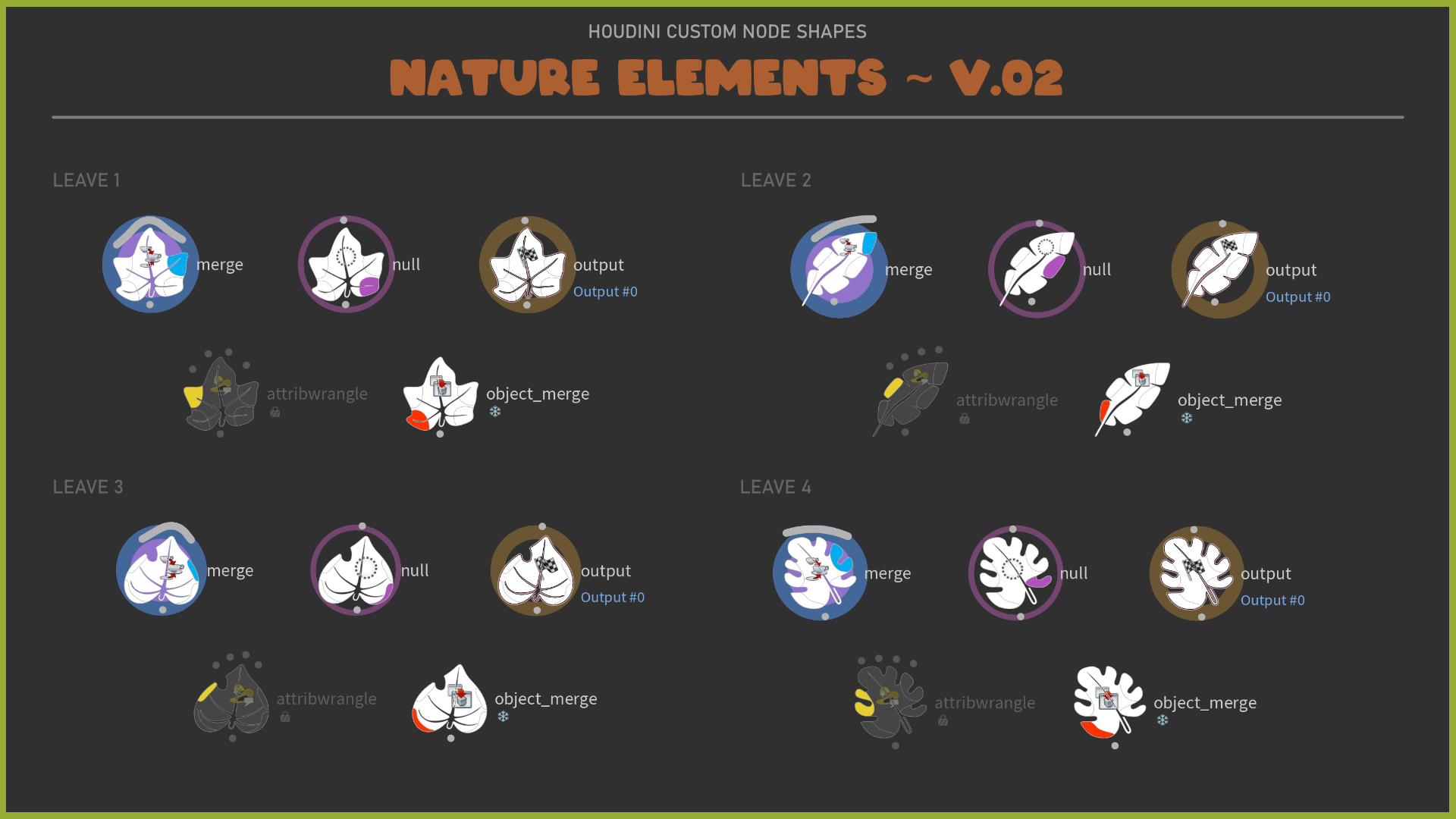 A set of customized node-shapes for Houdini. The theme is 'Nature Elements".